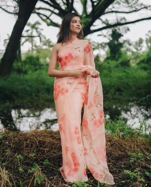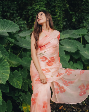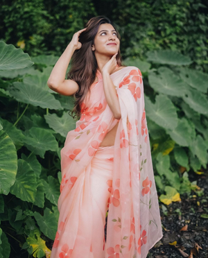 Peach Base Pure Organza Saree Hand-Painted With Coral Red Dogwood Flowers
