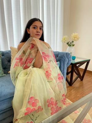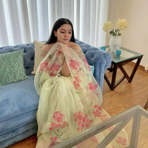 Pink Dogwood Flowers Hand-Painted On Green Base Pure Organza Saree, Enhanced With Sequines Work