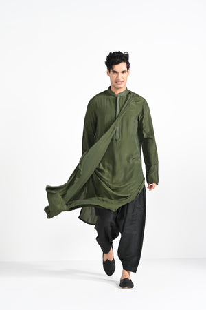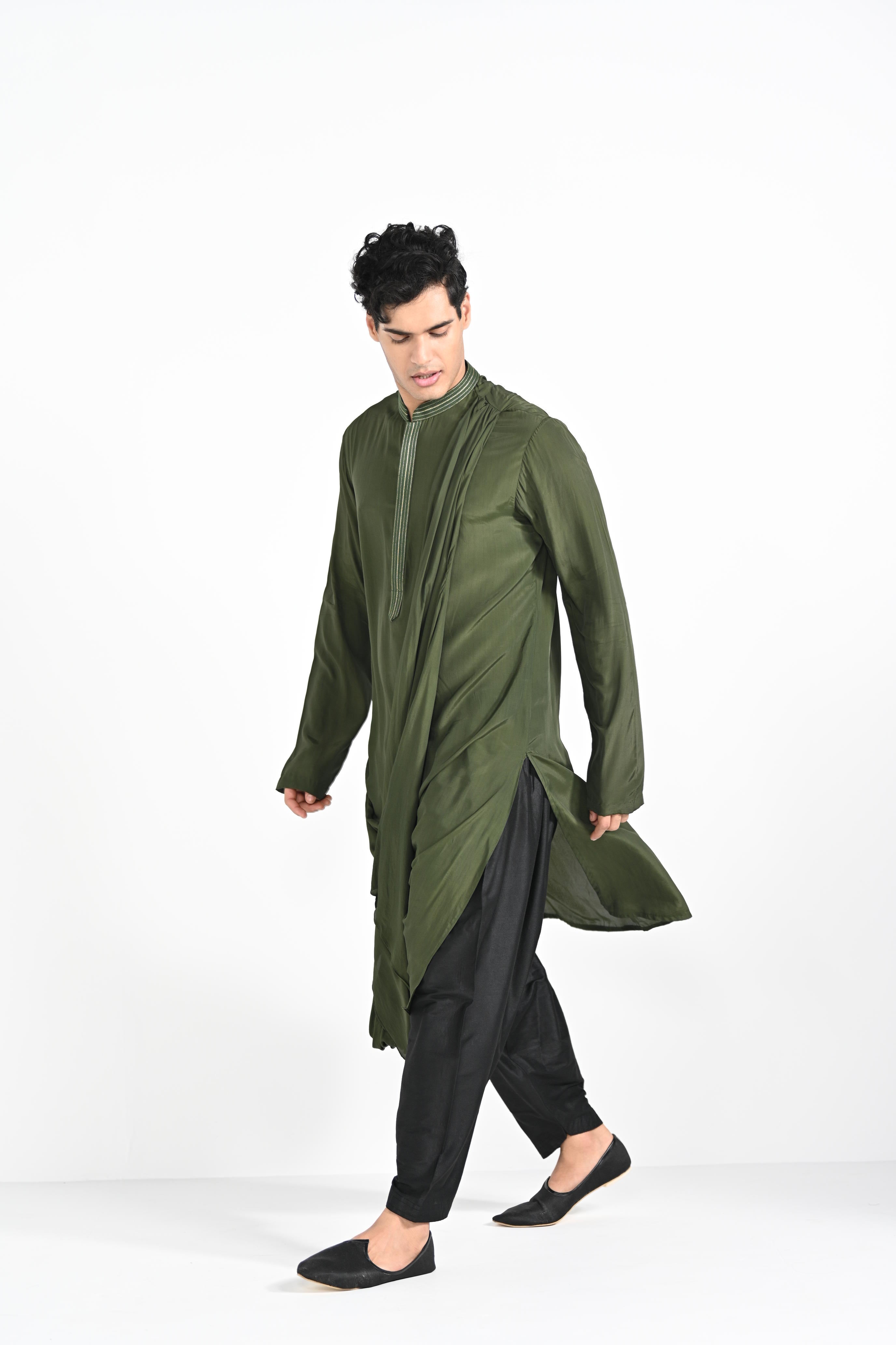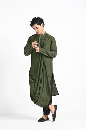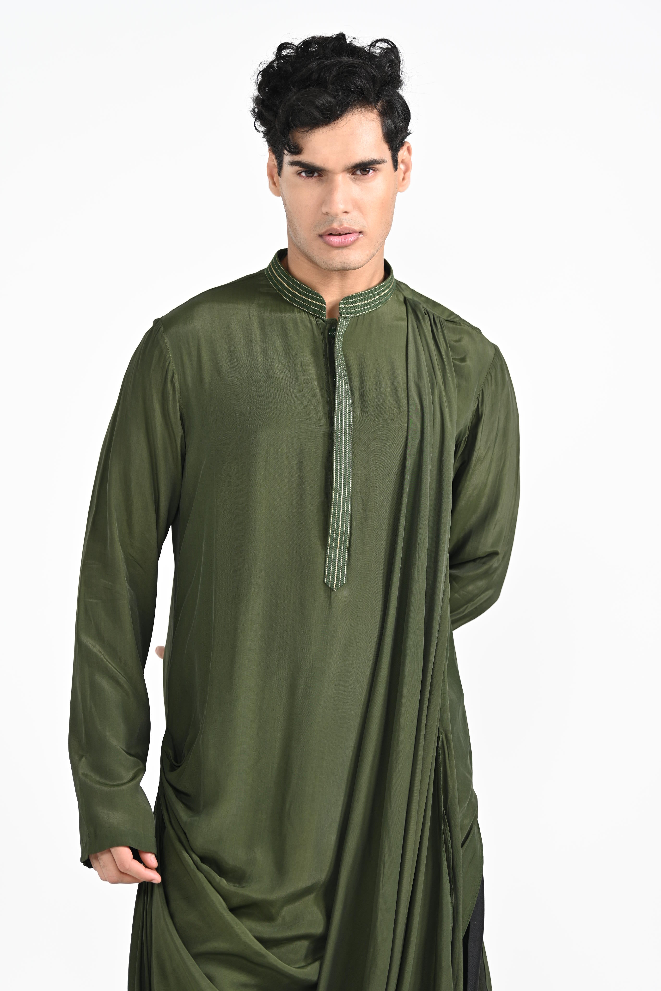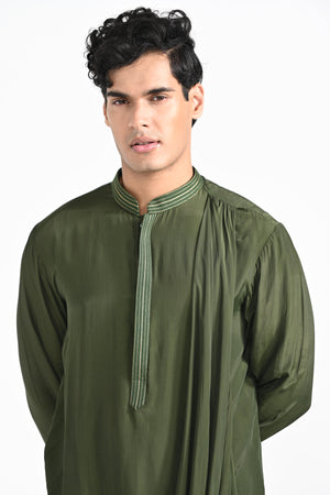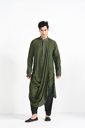 Dollar Bill Green Cowl Drape with zari stitchline detailing on natural crep.Paired with Buttercream slim fit Pant Pajama. Color of the actual garment may vary due to lighting conditions during the shoot .