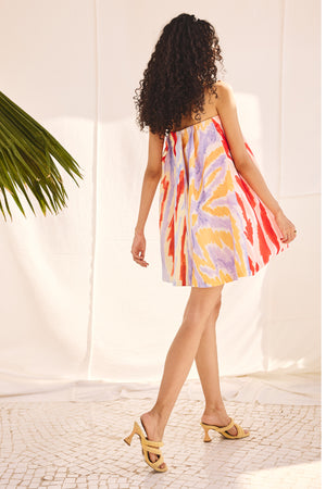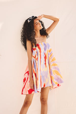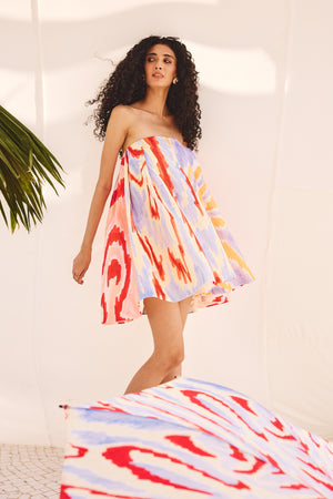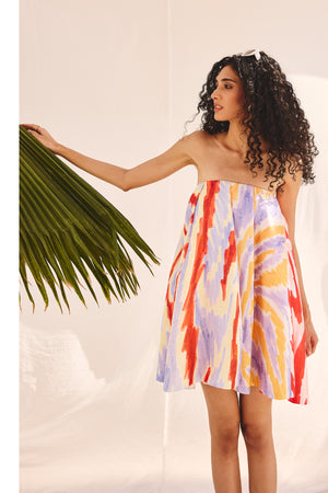 This strapless, mid-thigh dress features a voluminous skirt for added fullness, creating a