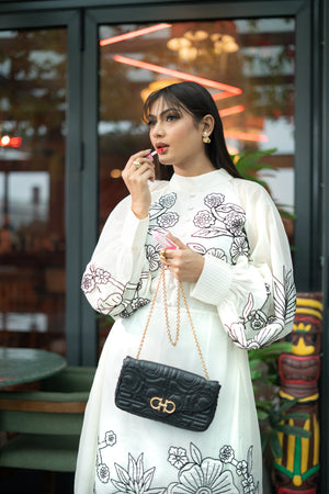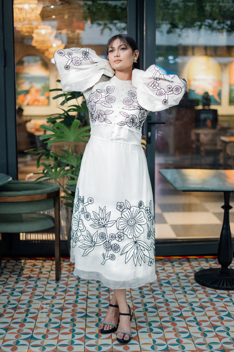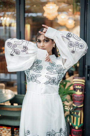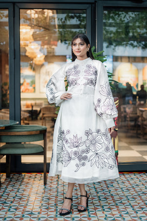 Turn heads with this sophisticated off-white midi dress, featuring bold black floral embroidery that adds striking contrast and charm. The voluminous puff sleeves create a dramatic silhouette, while the relaxed fit ensures all-day comfort. Designed with a high neck and a flattering A-line cut, this dress is perfect for brunch dates, art events, or summer soirées.