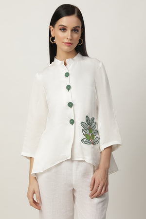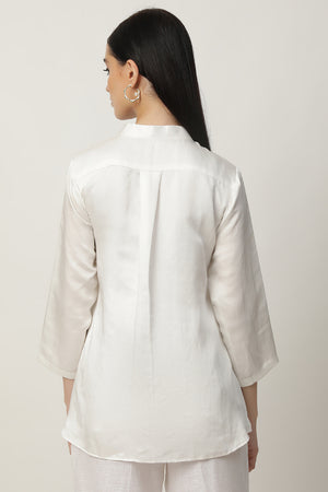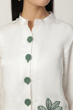 Ivory colour band neck high-low shirt in satin linen with embroidery detailing and contrasting deep green colour buttons to complete the look.
