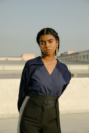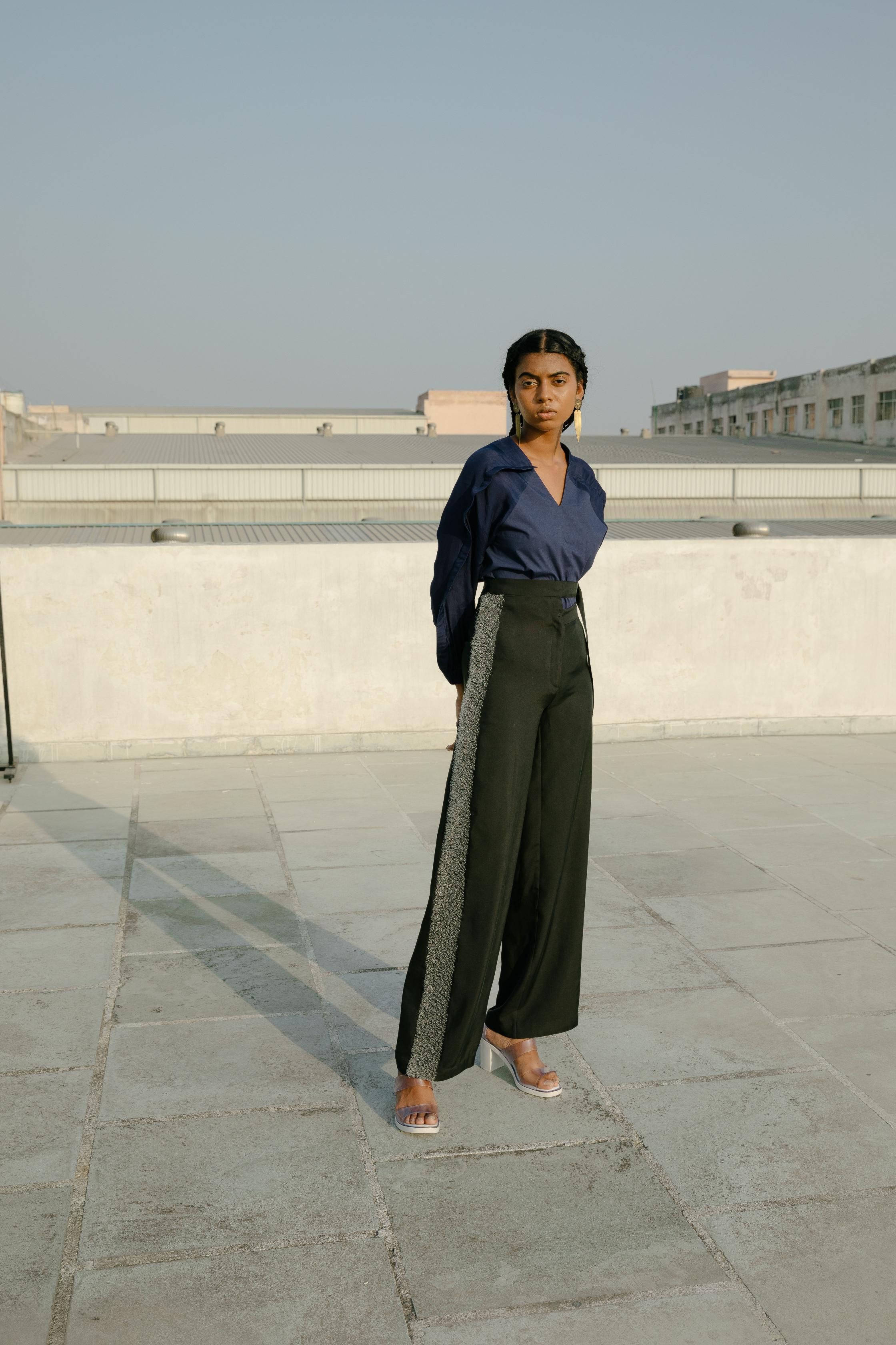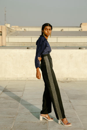 Charcoal trousers in silk with an asymmetric waist, tied with a belt. Features hand-embroidered PVC cord texture on one side. Flared fit.