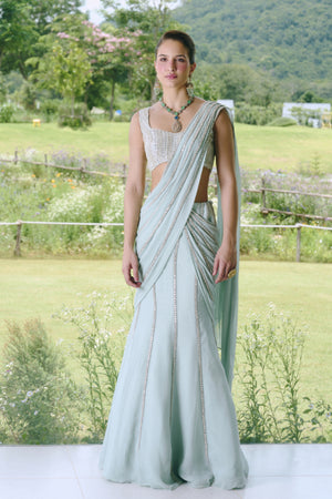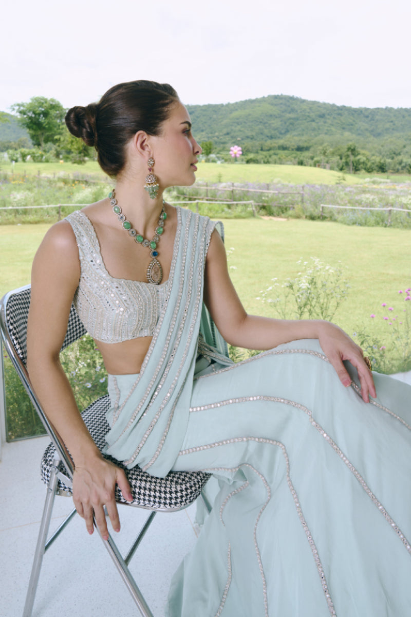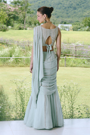 Mirror Work Fish cut Saree With Embellished Blouse In Mirror Work