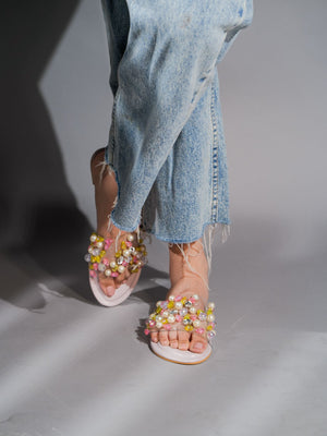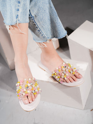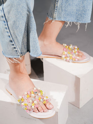 Looks like you embellished your feet directly ! Dramatically crafted with crystals, pearls and stones on a broad transparent band combined with patel lavendar cushioned base, this pair is versatile.