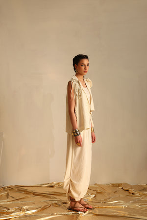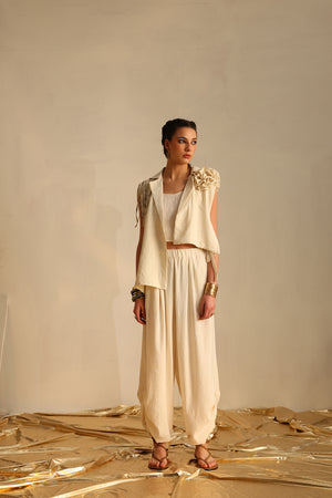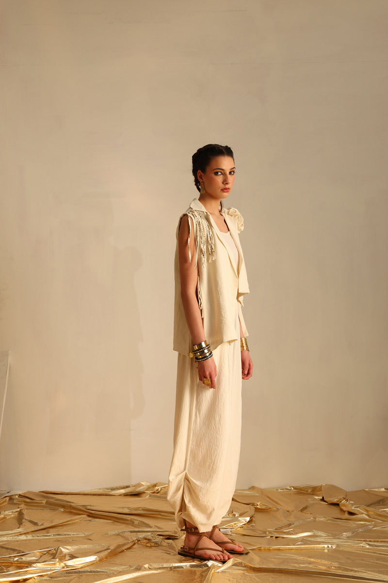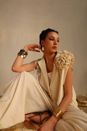 Dramatic flower blazer embellished with threadwork tassels on shoulder paired with a cargo pant