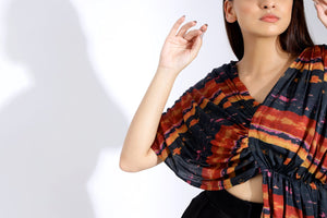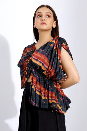 Featuring A Two-Piece Overall Digitally Printed Draped Blouse Attached Over A Fitted Blouse Paired With An Inverted Pleated Pants