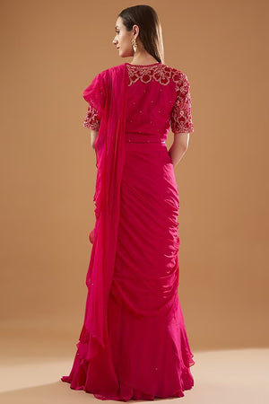Reddish Fuchsia Draped Lehenga Saree paired with fully embroidered blouse and Belt.