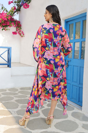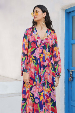 This Printed Mid Dress Is Made From Premium Georgette Fabric. This Dress Is Meticulously Hand-Embroidered, Featuring Pearl-Drop Sleeves.