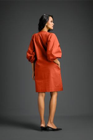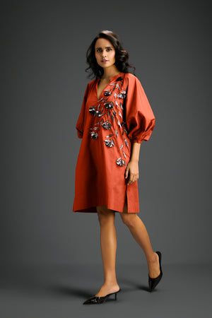 Rust V-Neck Dress With Puffed Sleeves And Metallic Floral Embroidery On The Shoulder
