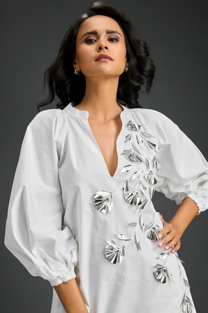 White V-Neck Dress With Puffed Sleeves And Metallic Floral Embroidery On The Shoulder