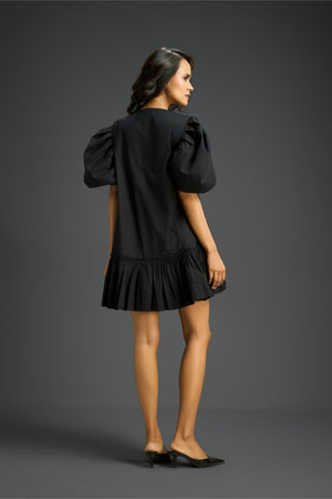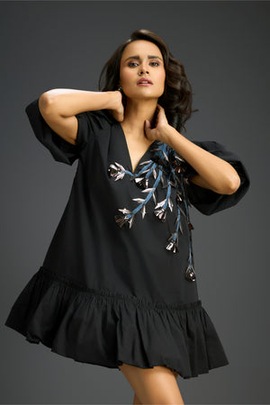 Black Dress With Puffed Sleeves, Ruffled Hem, And Orange Floral Embroidery On The Shoulder