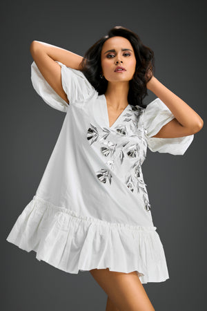 White Dress With Puffed Sleeves, Ruffled Hem, And Orange Floral Embroidery On The Shoulder