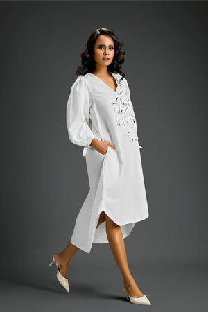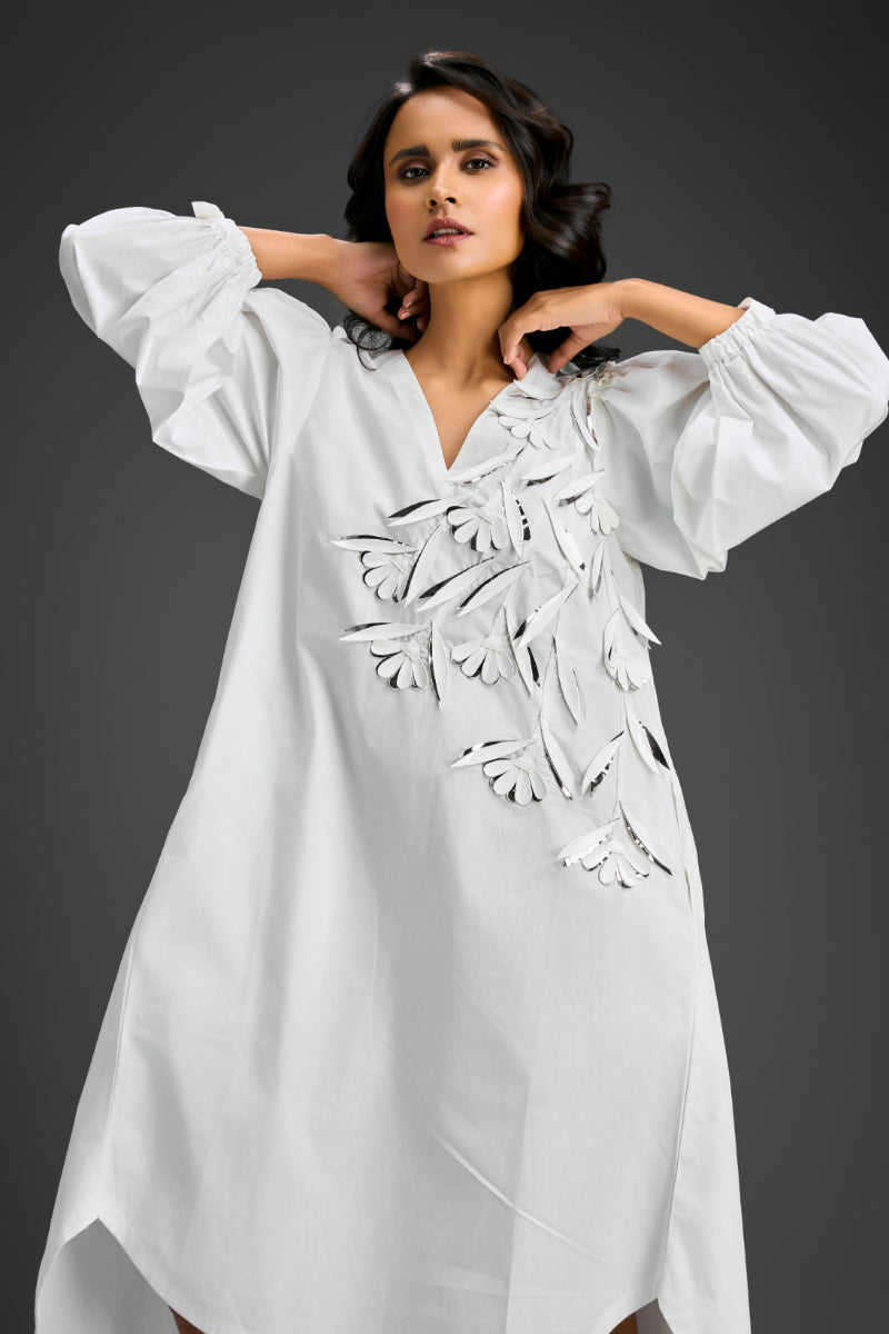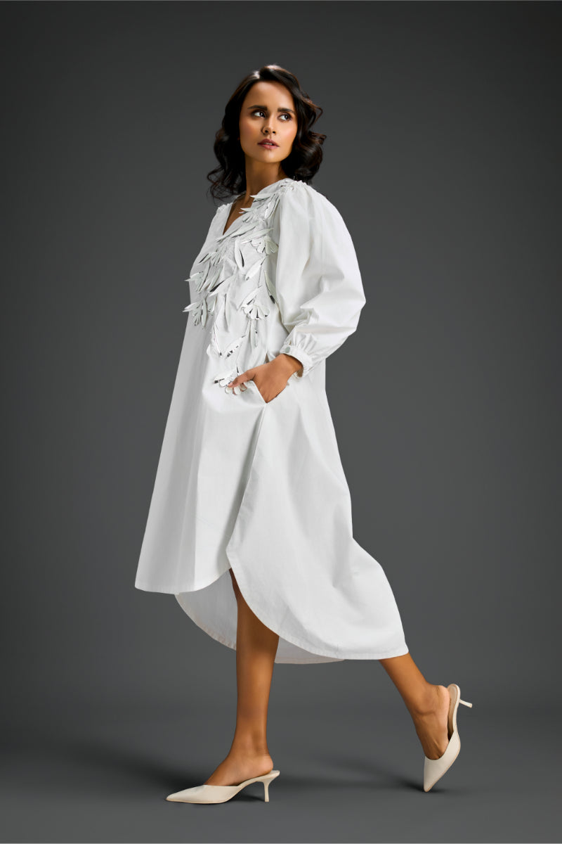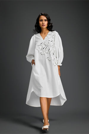 White High-Low V-Neck Dress With Puff Sleeves & Statement Embellishment