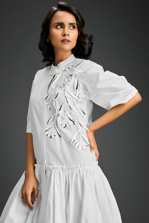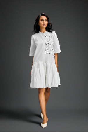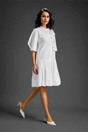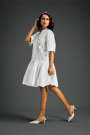 White Bubble Hem Dress With Puff Sleeves And 3D Floral Embellishment