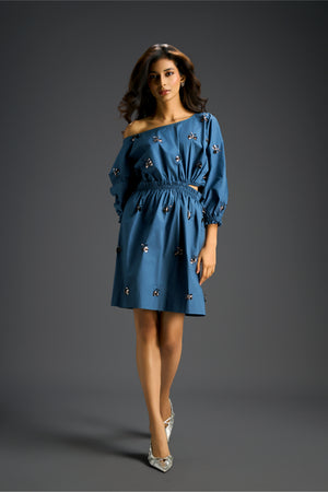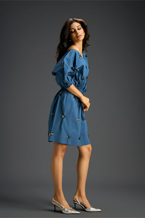 Blue Off-Shoulder Cotton Dress With Balloon Sleeves And An Elasticated Waist, Detailed With Delicate Hand-Embellished Butterfly Motifs