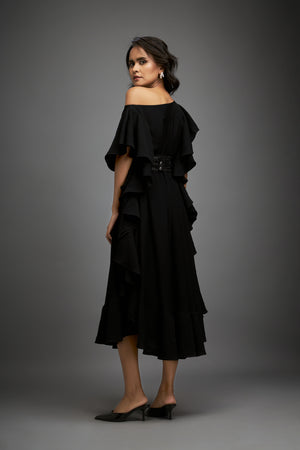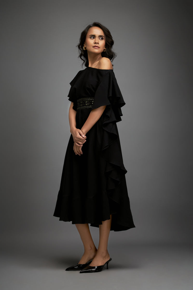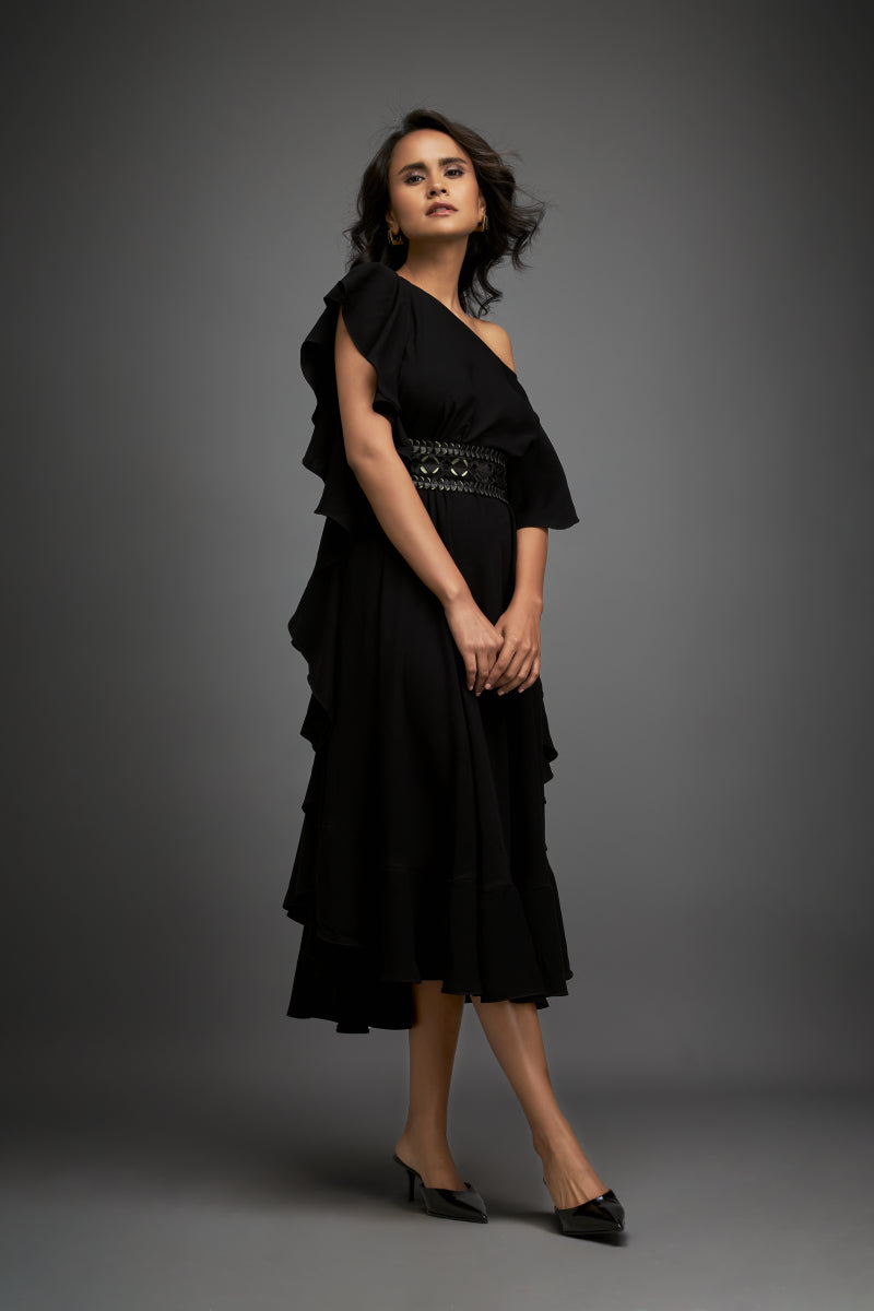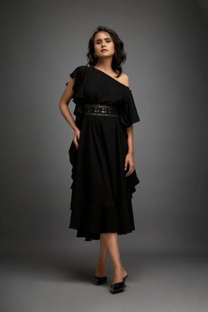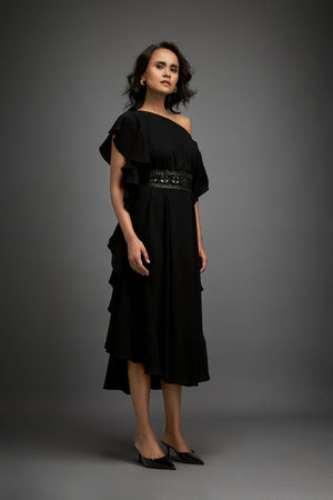 Black Asymmetrical Off-Shoulder Dress With Cascading Ruffles And A Wide Metallic Green Textured Waist Belt