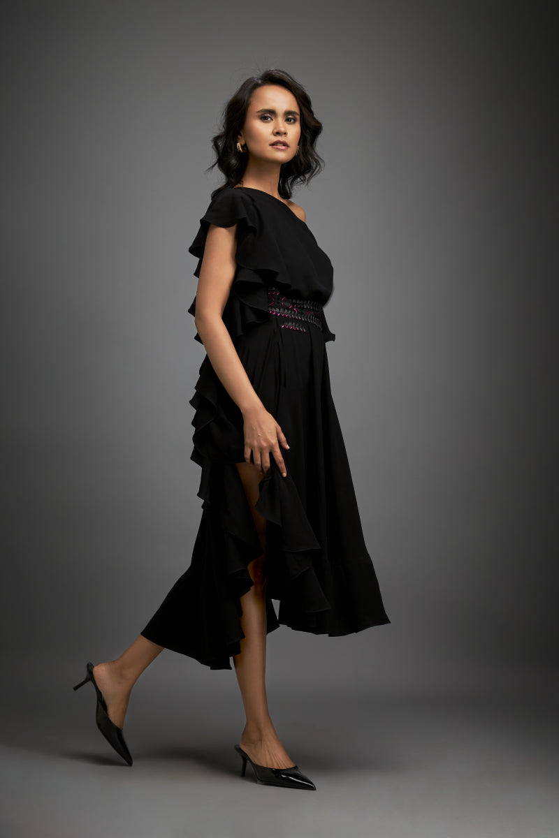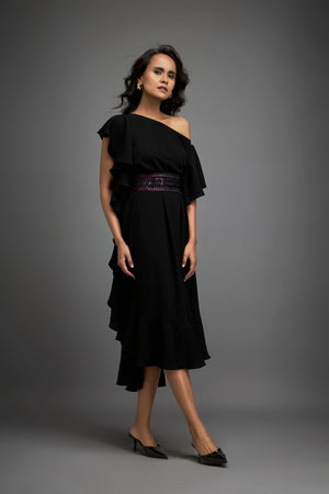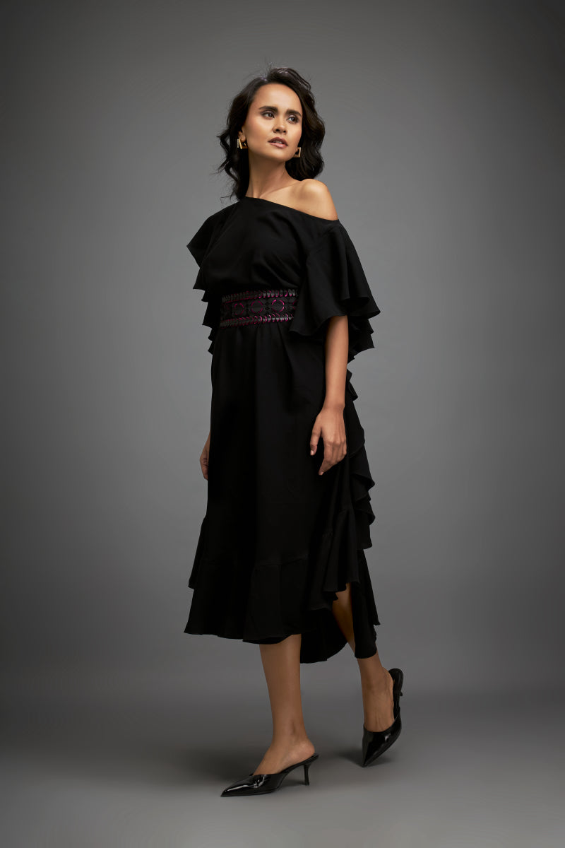 Black Asymmetrical Off-Shoulder Dress With Cascading Ruffles And A Wide Metallic Pink Textured Waist Belt