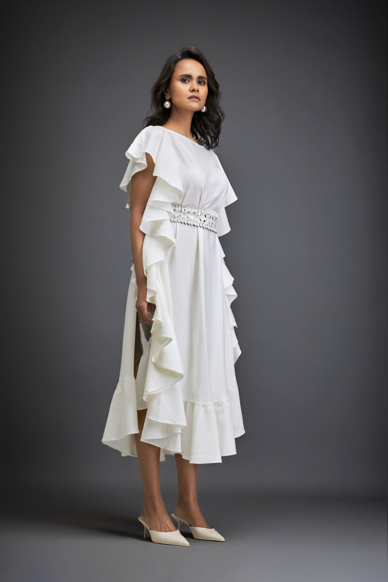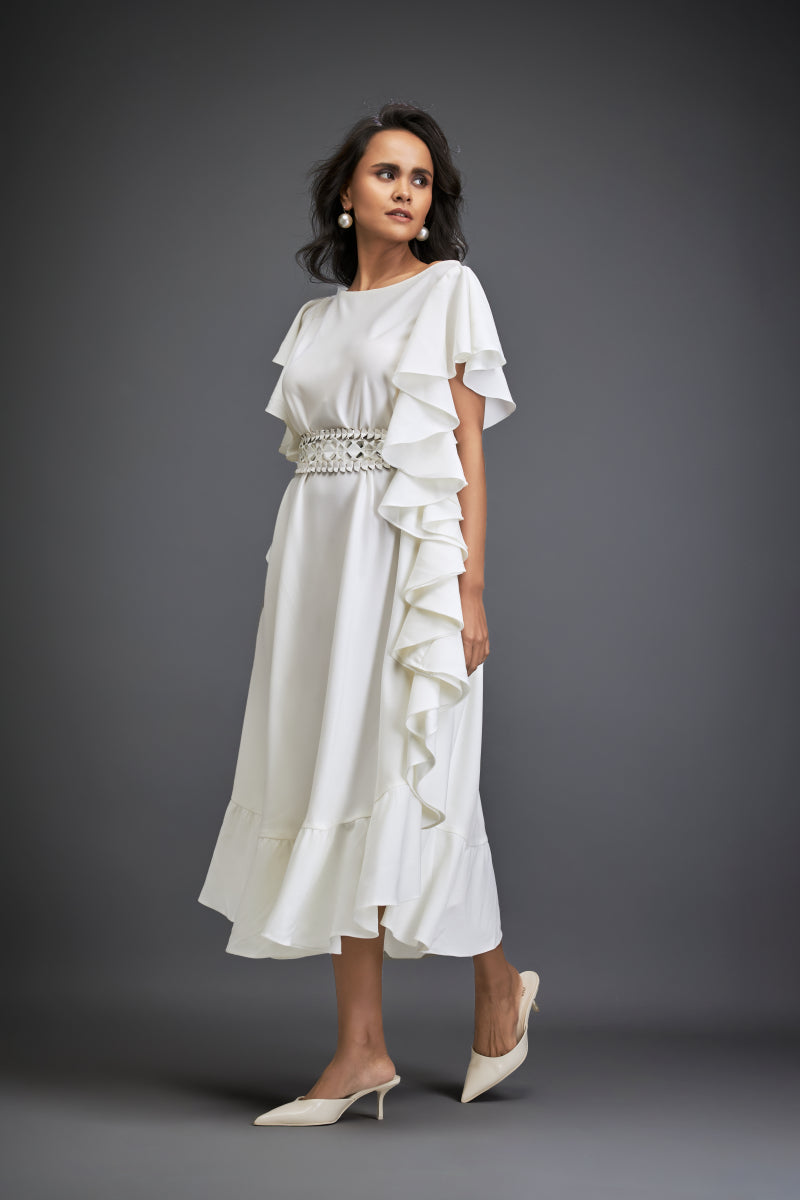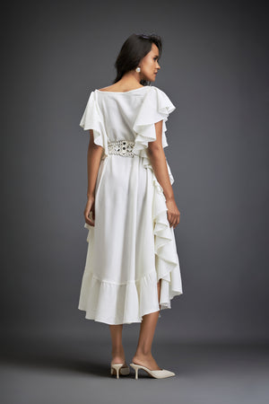 White Asymmetrical Off-Shoulder Dress With Cascading Ruffles And A Wide Metallic Silver Textured Waist Belt