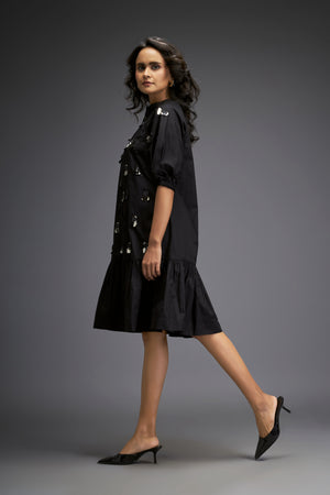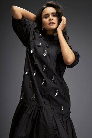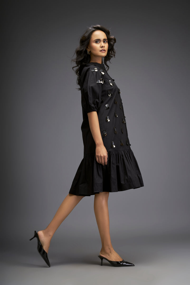 Black Voluminous Silhouette Dress With Puff Sleeves And Glossy Metallic Gun Metal Discs And A Ruffled Hemline