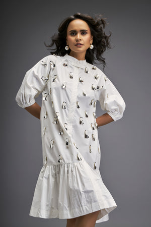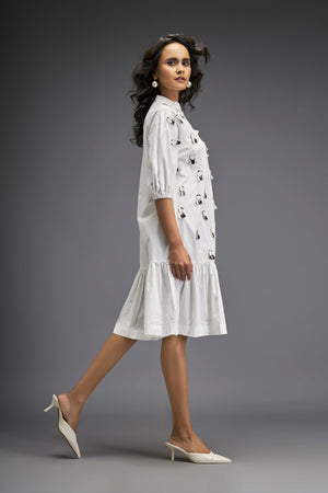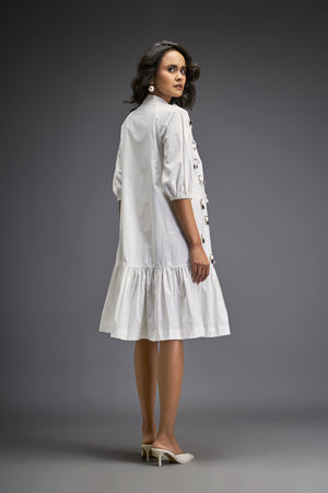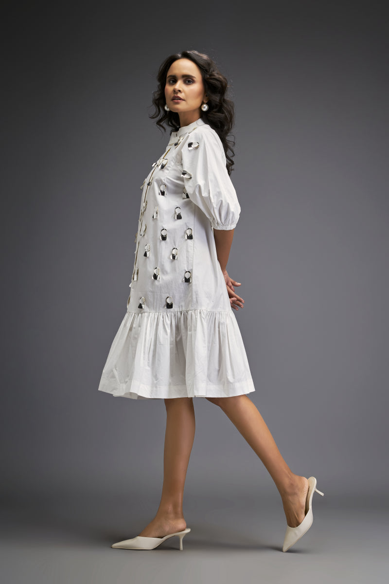 White Voluminous Silhouette Dress With Puff Sleeves And Glossy Metallic Silver Discs And A Ruffled Hemline