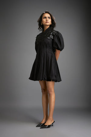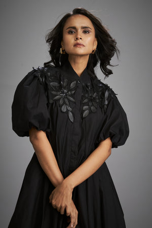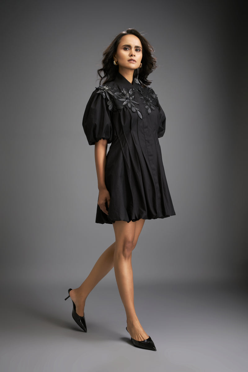 Structured Mini Dress With Puff Sleeves And Floral Applique Detailing