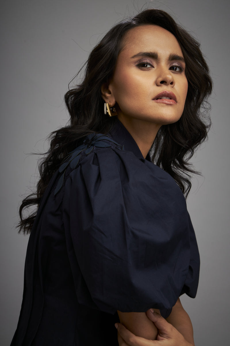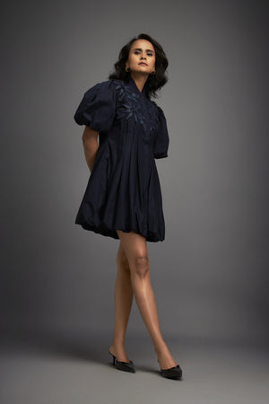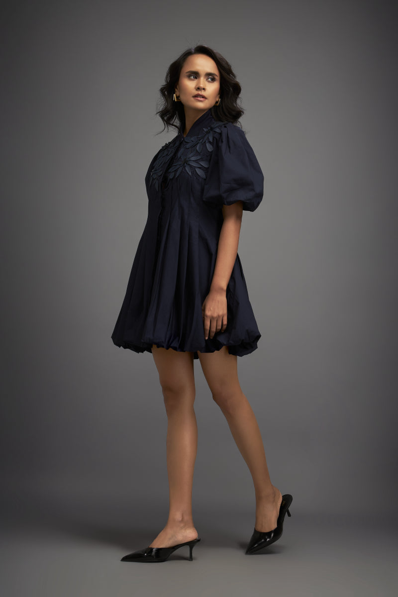 Structured Mini Dress With Puff Sleeves And Floral Applique Detailing