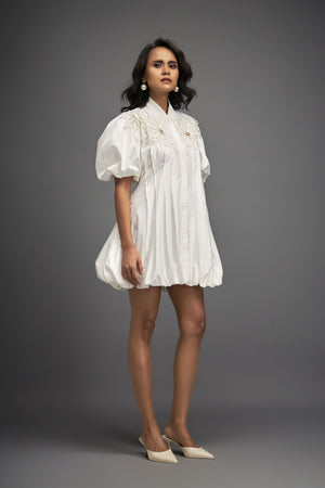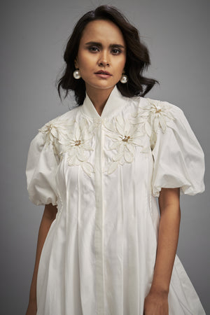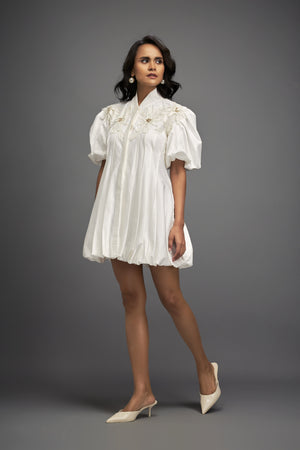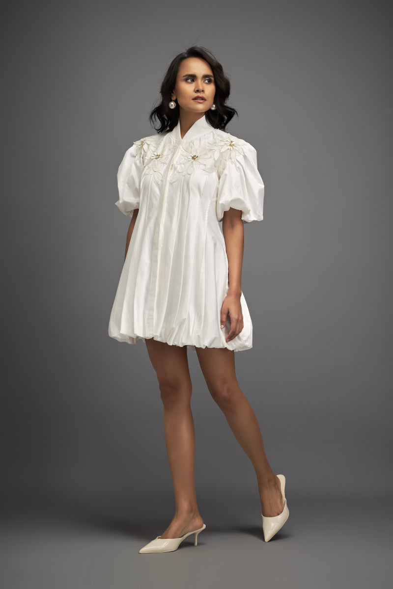 Structured Mini Dress With Puff Sleeves And Floral Applique Detailing