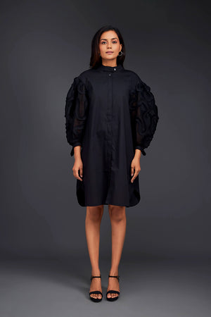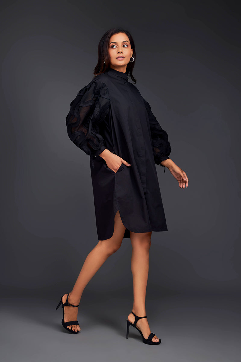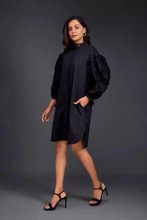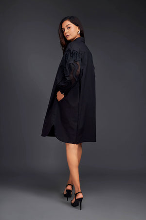 Black Shirt Dress With Pleated Frill Detailing On Sleeves