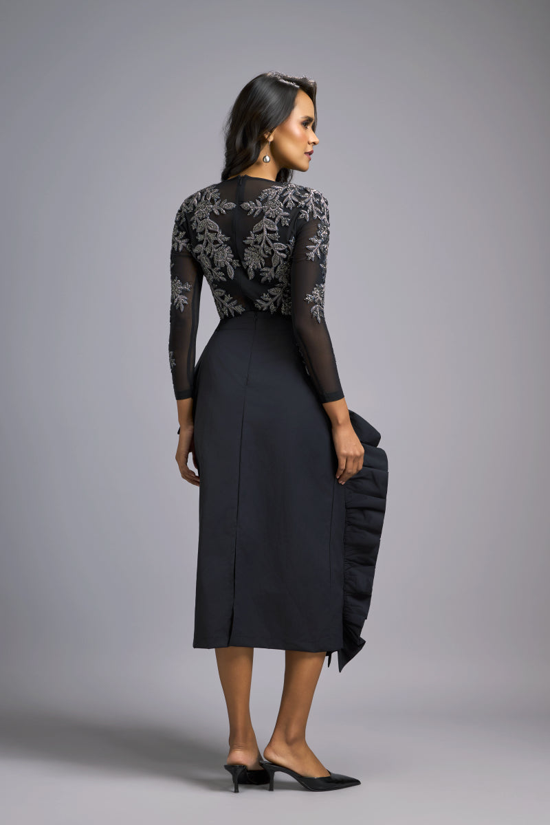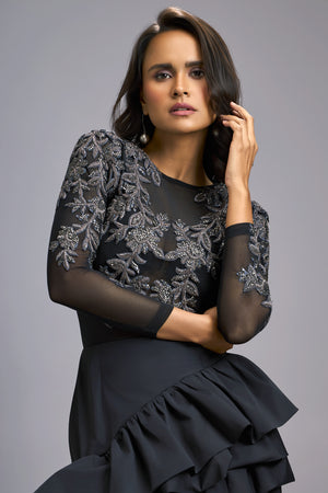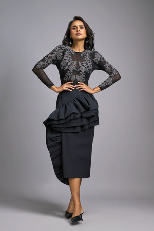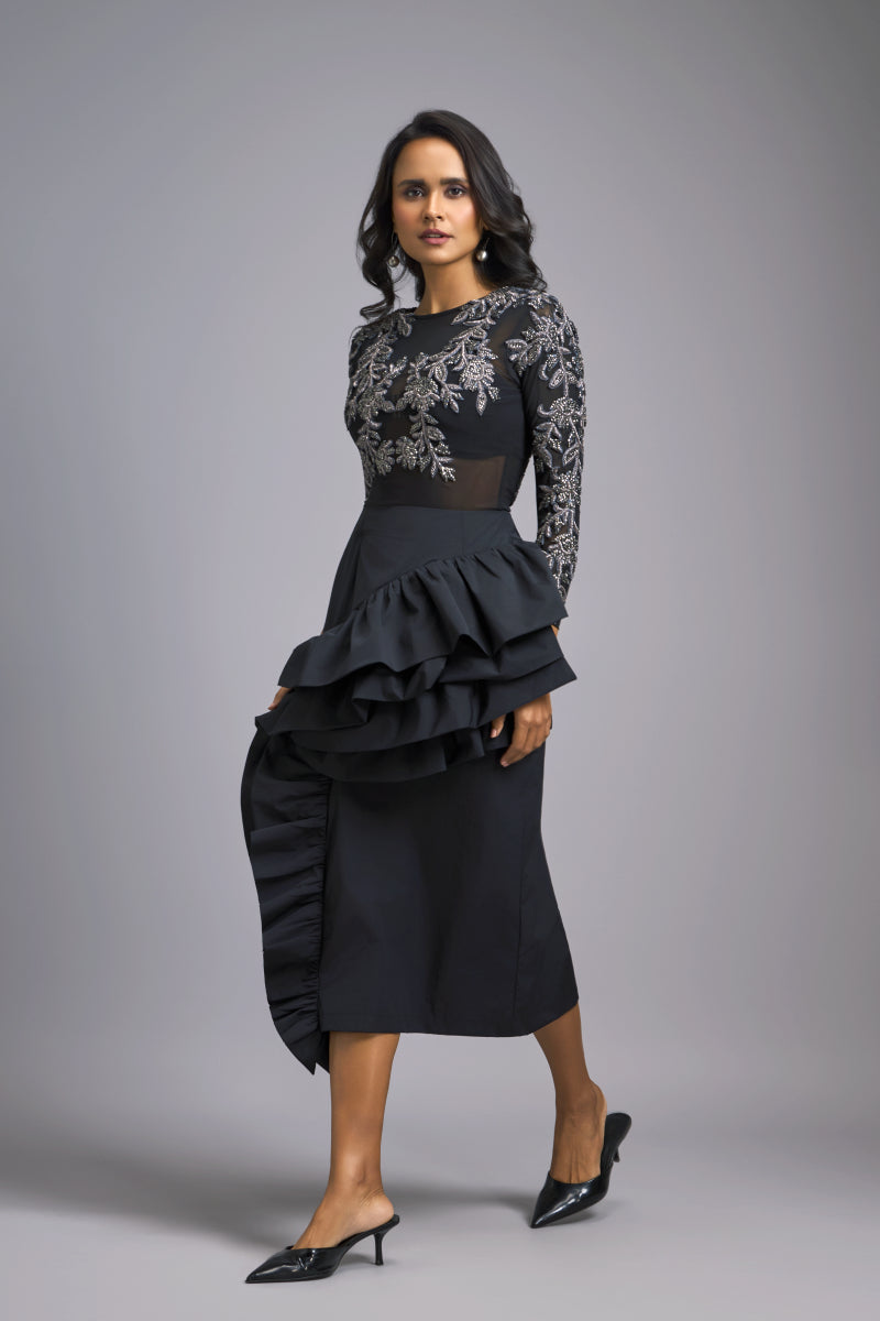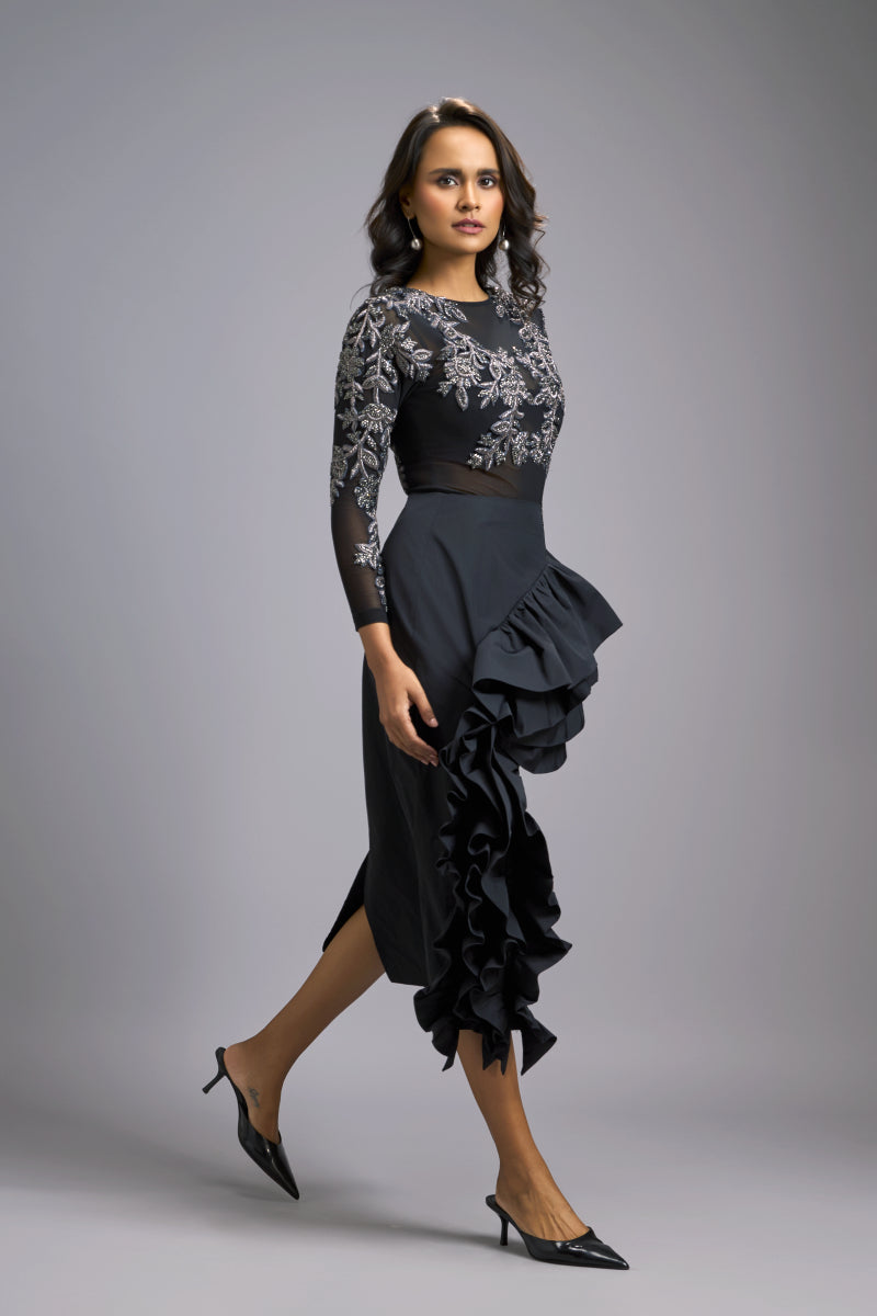 Elegant Sleeved Ensemble Adorned By Intricate Embroidered Swarovski And Asymmetrical Skirt.