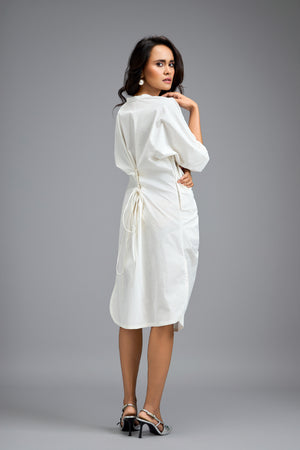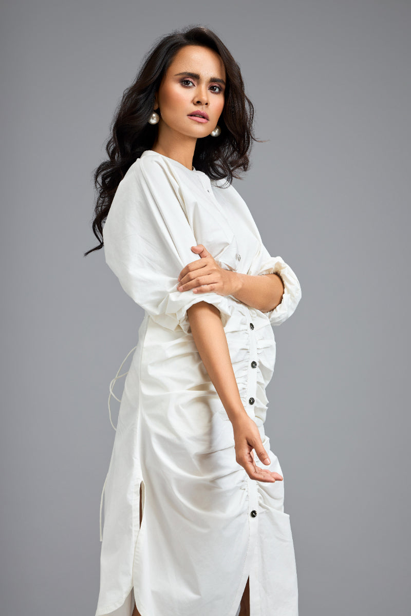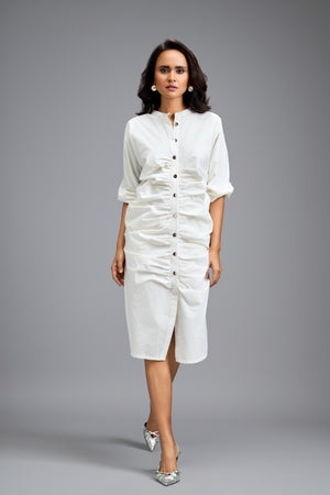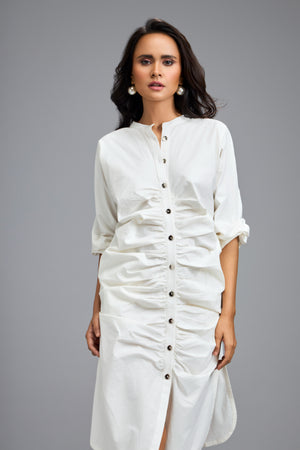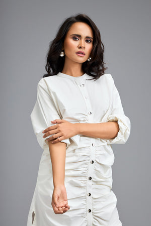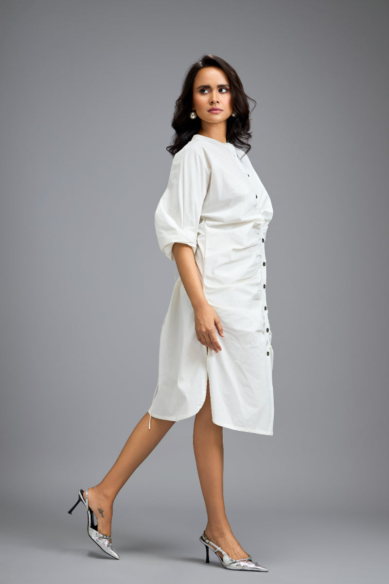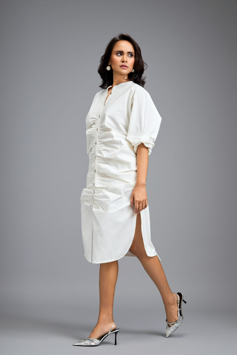 White Shirt Dress With Button-Down Front, Featuring Ruched Detailing Along The Center And Rolled-Up Sleeves