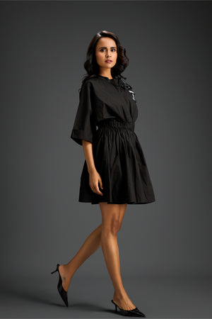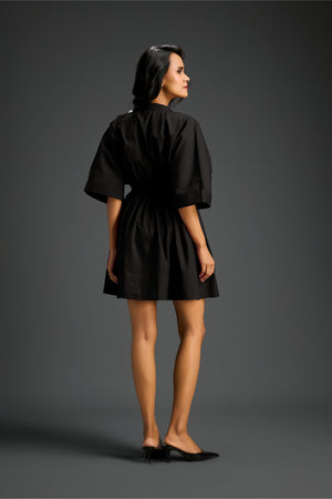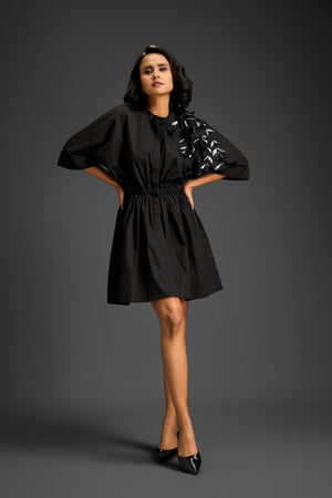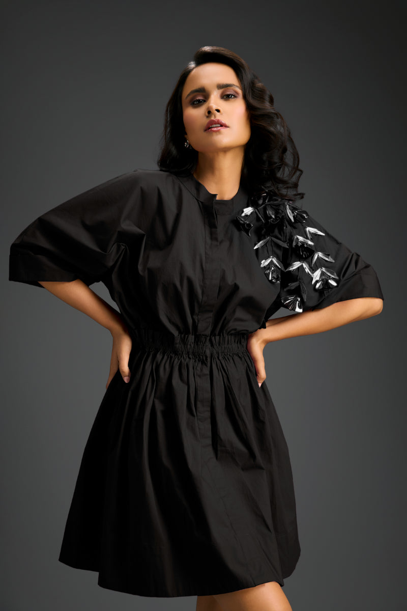 Black Shift Dress With Floral Embroidery On The Shoulder