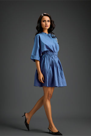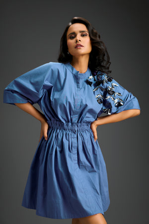 Blue Shift Dress With Floral Embroidery On The Shoulder