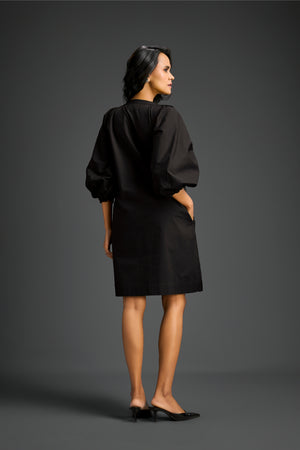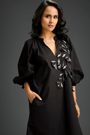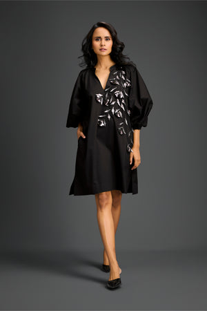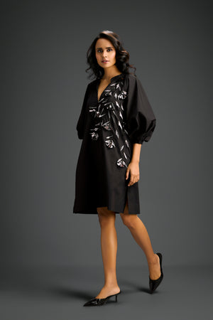 Green V-Neck Dress With Puffed Sleeves And Metallic Floral Embroidery On The Shoulder