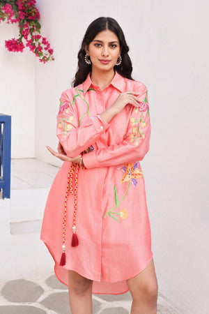 Raw Silk Shirt Dress Embellished With Intricate Embroidery, Paired With Crafted Handmade Waist Belt.