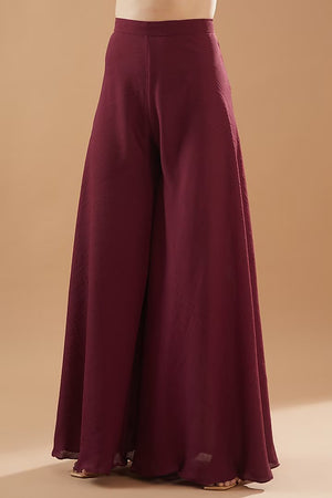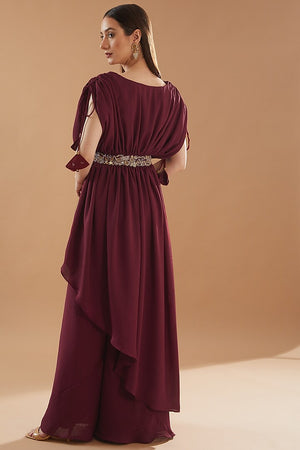 Maroon Gathered High-Low Dress Embroidered on Waist Comes with Palazzo Set.