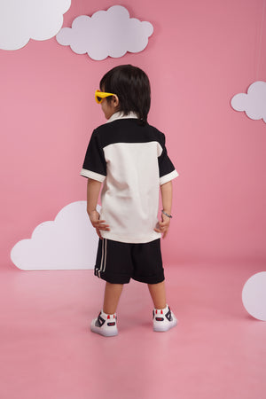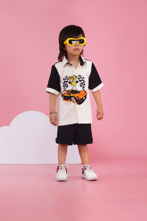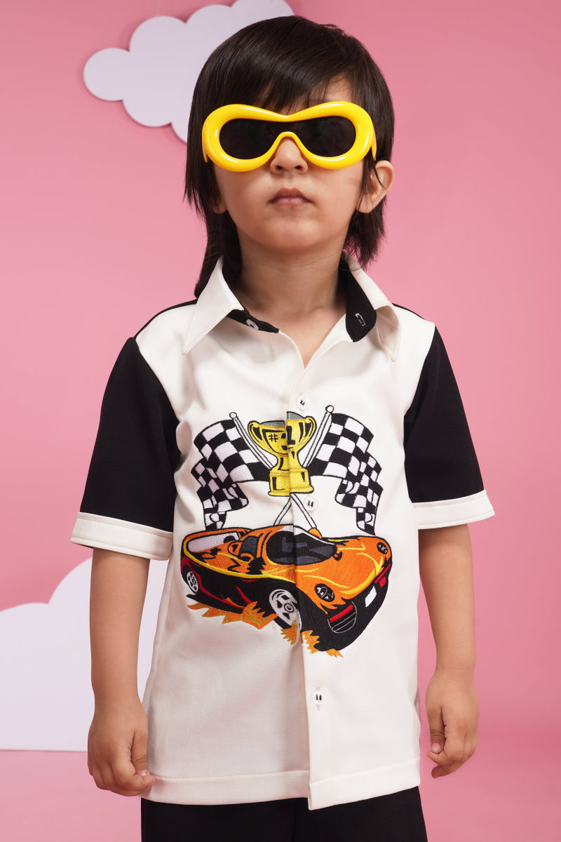 A white and black luxury crepe shirt and shorts set with amazing racing car embroidery in the front