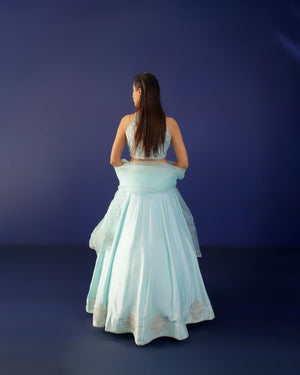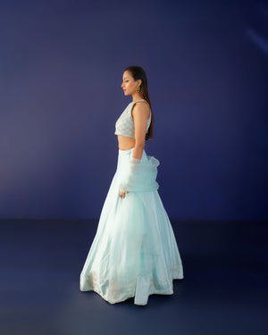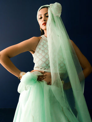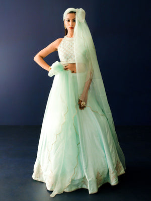 Powder Green Zari and Hand Pearl Embroidered Lehenga Set with Pure Silk Organza Dupatta