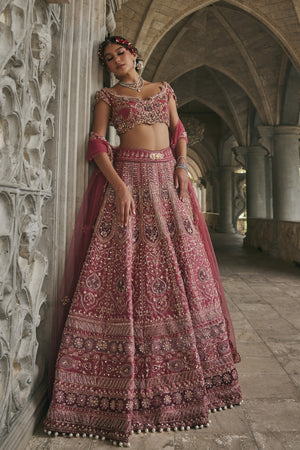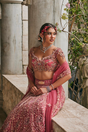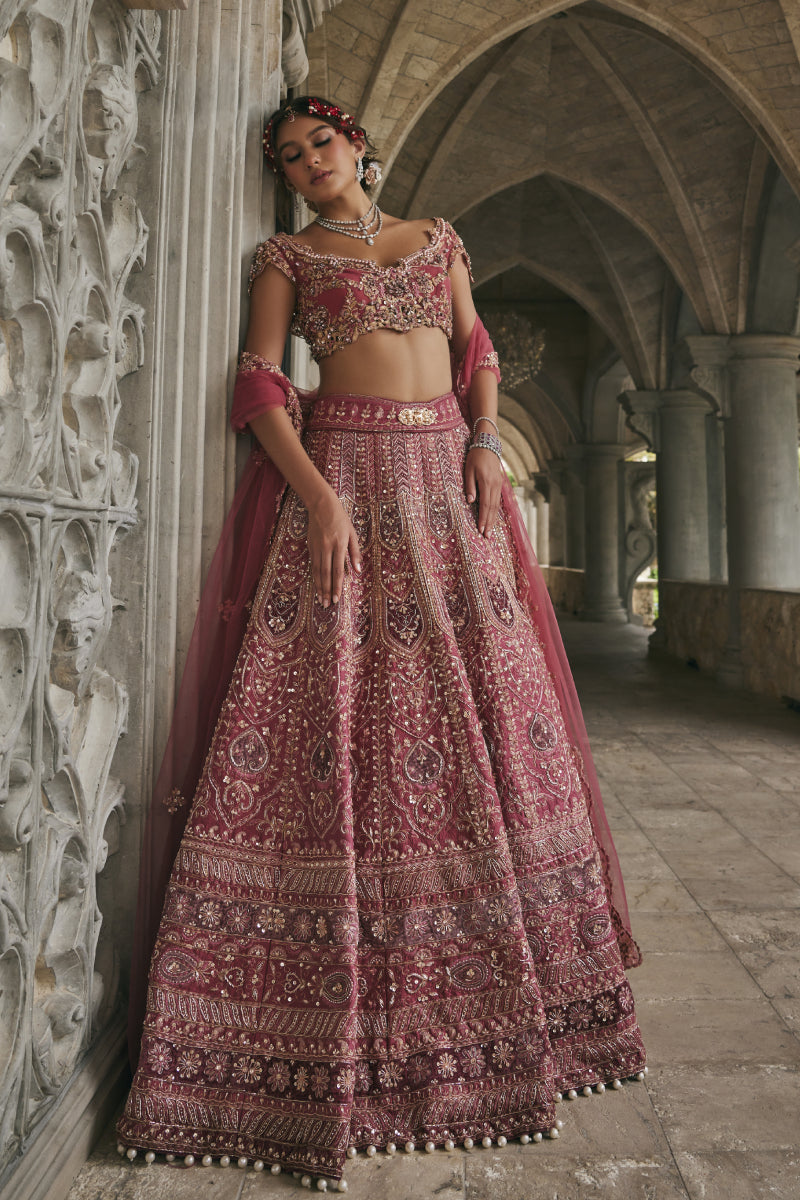 This exquisite lehenga set, drenched in a vibrant rosy hue reminiscent of Pantone Dusky Pink.