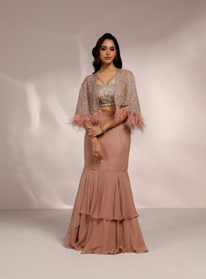 Double layered fish cut georgette skirt paired with heavy embroidered cape and bustier.
