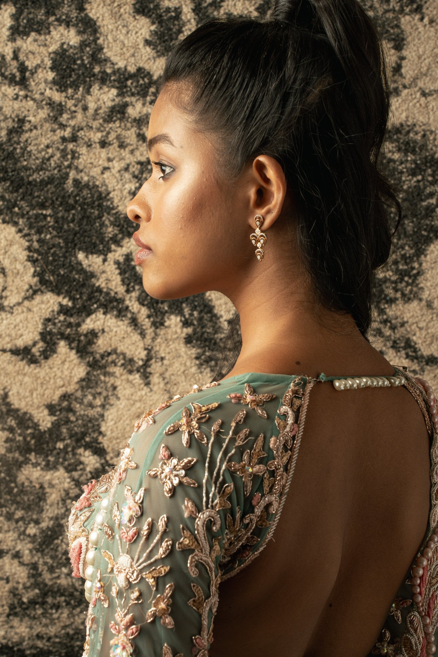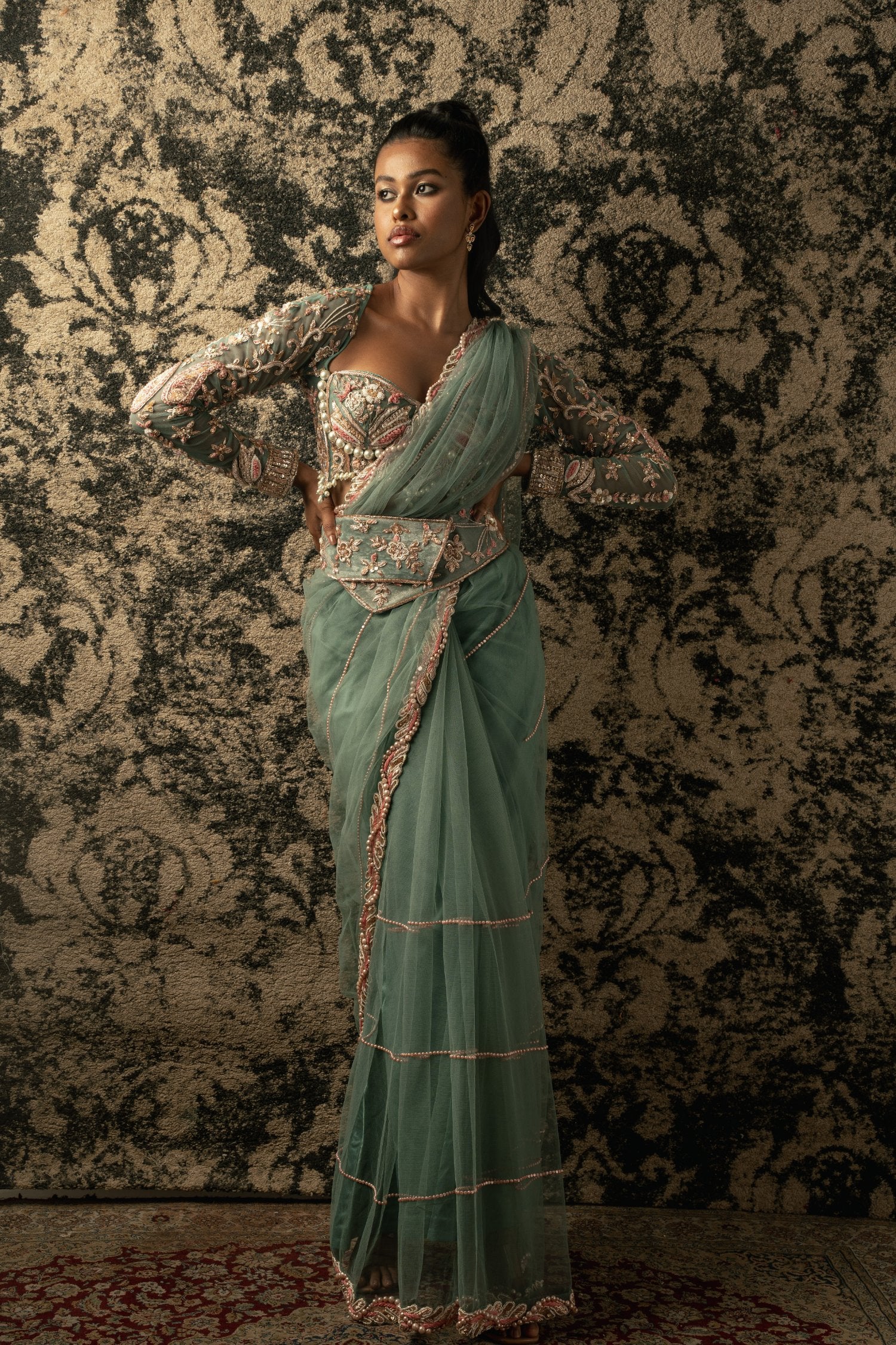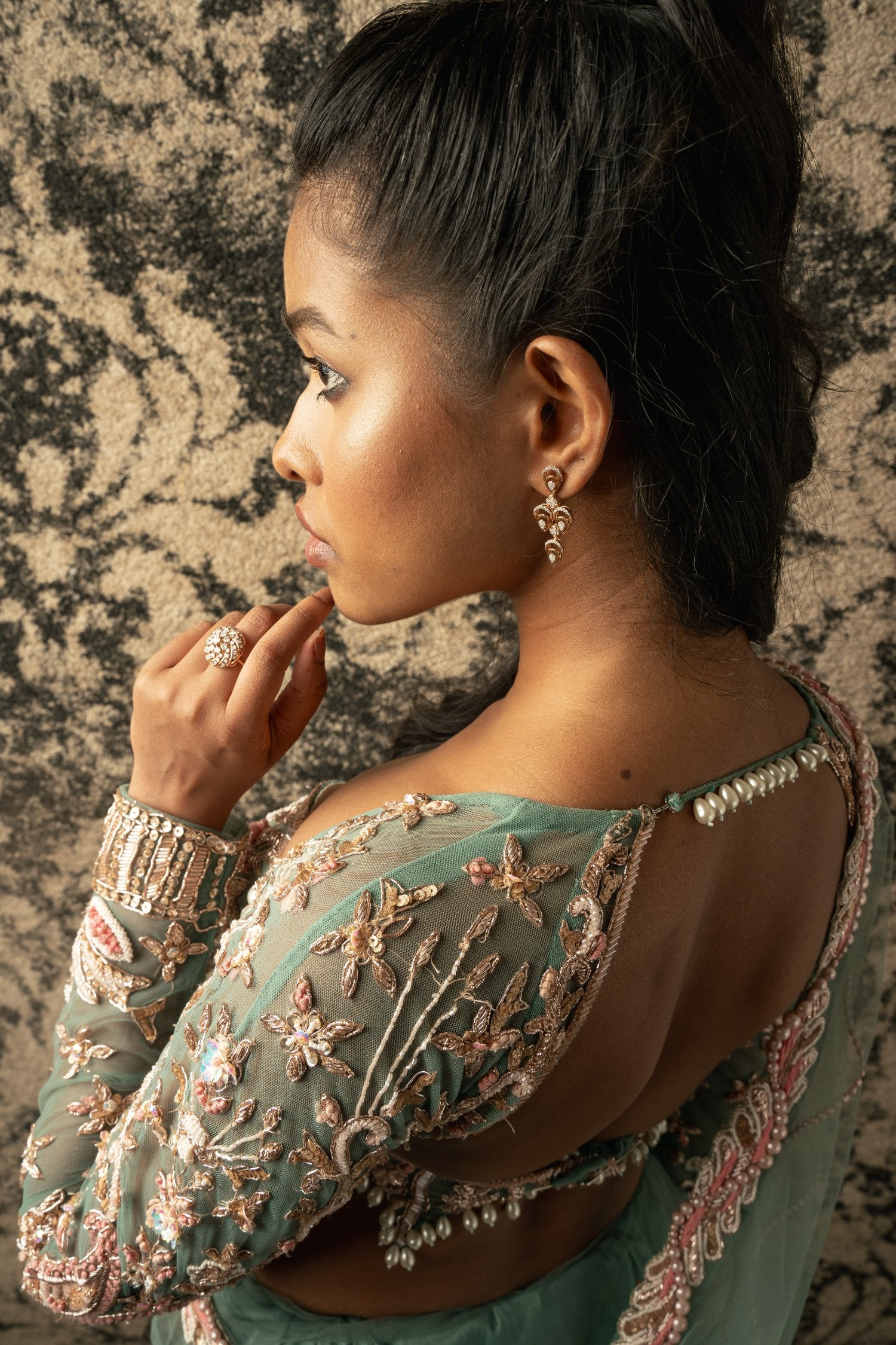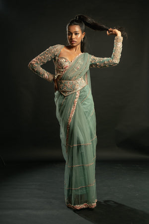 This enchanting dusty turquoise saree is crafted from delicate net fabric, radiating an ethereal charm that captivates the imagination. Paired with a matching net blouse adorned with a flair of pink, it emanates a bridal and festive aura that is simply irresistible. So mesmerizing is its allure that one might be compelled to invent an occasion just to don its elegance and grace. Perfect for weddings, celebrations, or any special event, this saree is a true embodiment of beauty and festivity, destined to make every moment memorable.