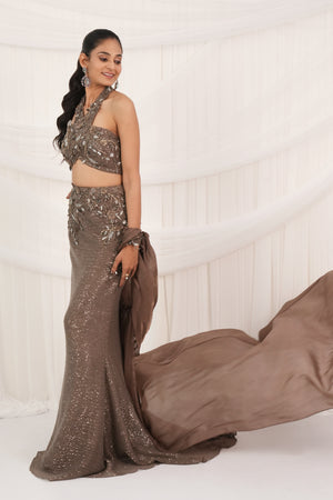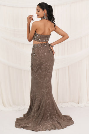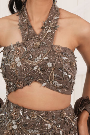 A true masterpiece featuring a show-stopping mermaid skirt with a trail, paired with a stylish crisscross halter neck. Tonal 3D embroidery inspired by natural elements adds depth, while a dramatic trail cape completes the look—perfect for making a grand, unforgettable entrance. Elegance and allure in every detail.