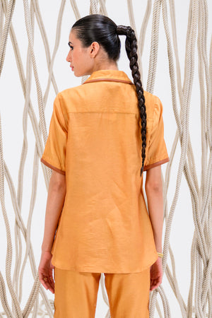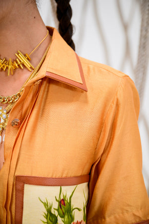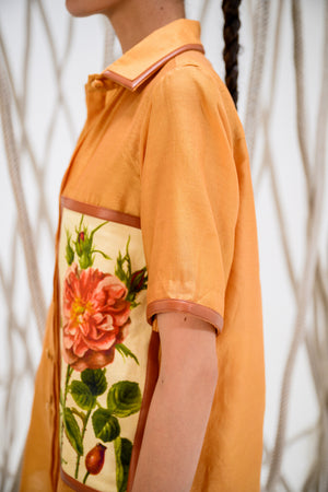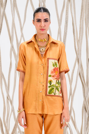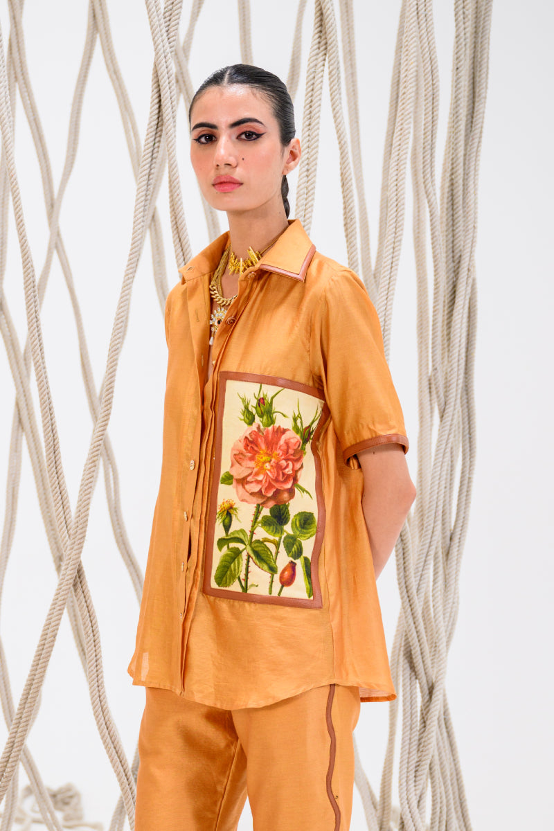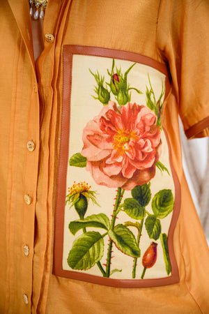 Turn heads and hearts with the Dusty Darling Shirt. Crafted from premium tan Chanderi, this shirt features bold front pleats for a touch of sophistication. The pièce de résistance is a larger-than-life vintage rose patch, framed in leather on one side, while matching brown leather detailing on the sleeves and collar completes the look. This shirt seamlessly combines classic romance with a modern twist.