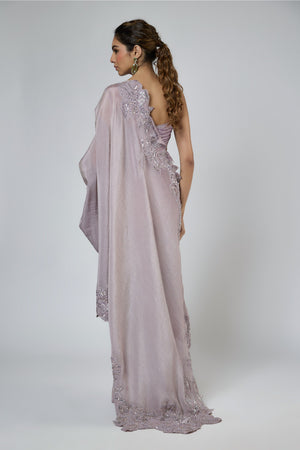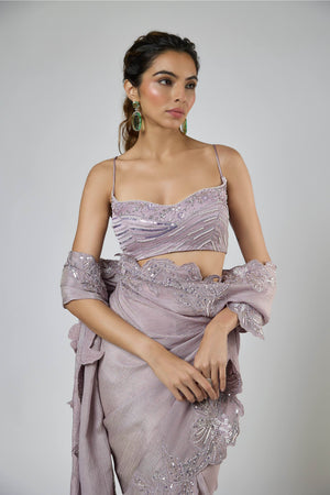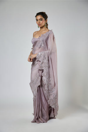 A dreamy ombré drape in shades of lilac and pink, intricately detailed with floral cutwork embroidery. The fusion of tissue and crushed tissue creates a fluid silhouette, paired with a Tussar silk blouse for a refined couture finish.