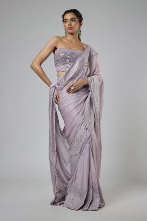 A modern take on classic couture, this dusty lilac saree in Bemberg satin georgette features intricate embroidery and tassel details, paired with an off-shoulder Tussar silk corset—embodying strength and grace in perfect balance.