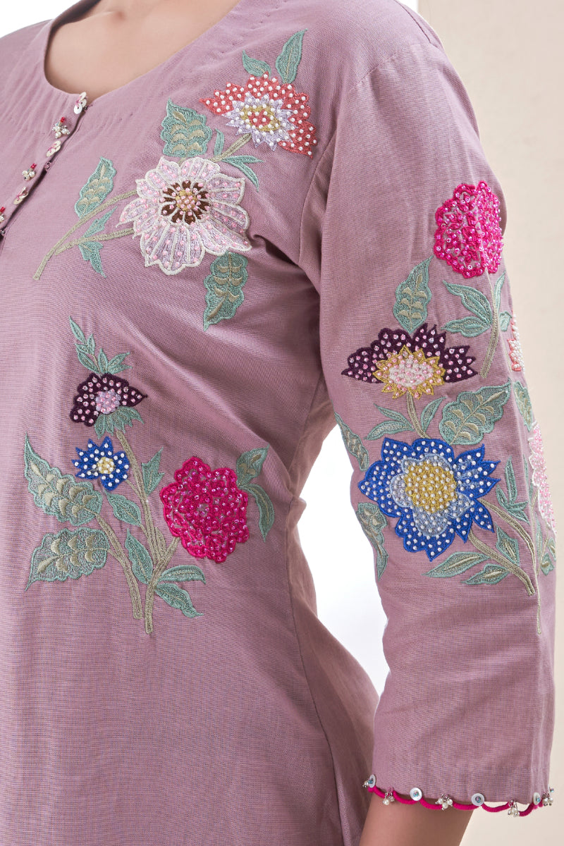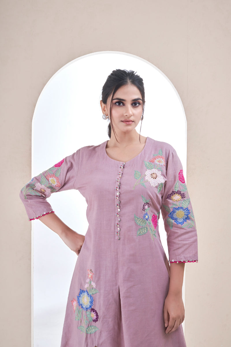 A dreamy blue co-ord set adorned with delicate hand-embroidered floral motifs on the kurta and trousers detailed with pearls. A graceful blend of craft and colour — perfect for festive mornings and refined daywear.
