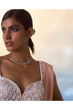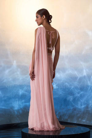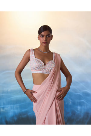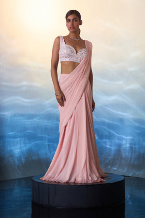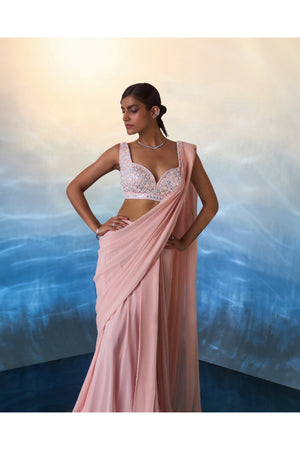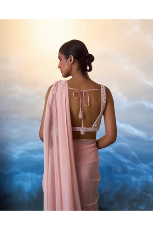 A dusty peach draped georgette saree paired with a hand embroidered blouse using multi colored sequins, crystals and bugle beads.
