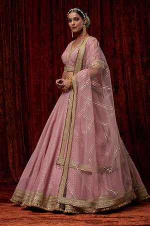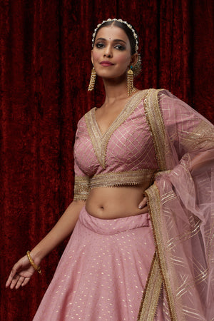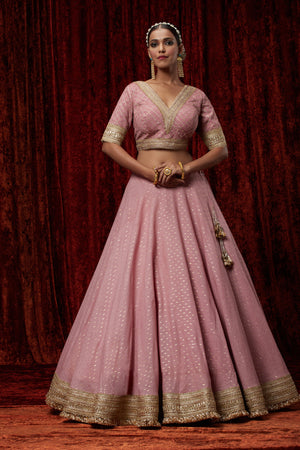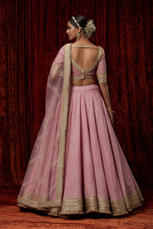 Featuring This Dusty Pink Cotton Chanderi Lehenga With Fine Gota Work. It's Paired With Chanderi Blouse And Net Dupatta.