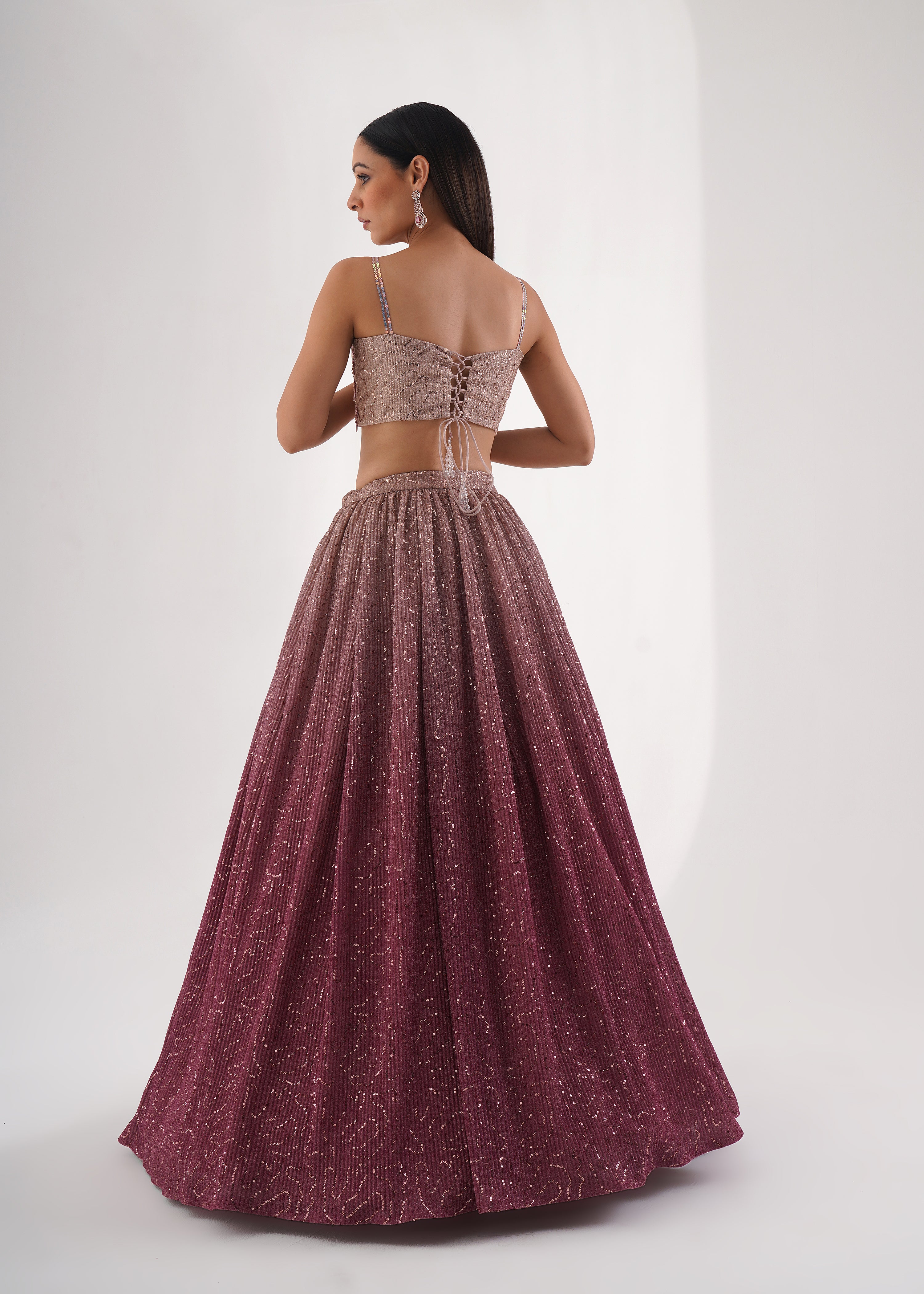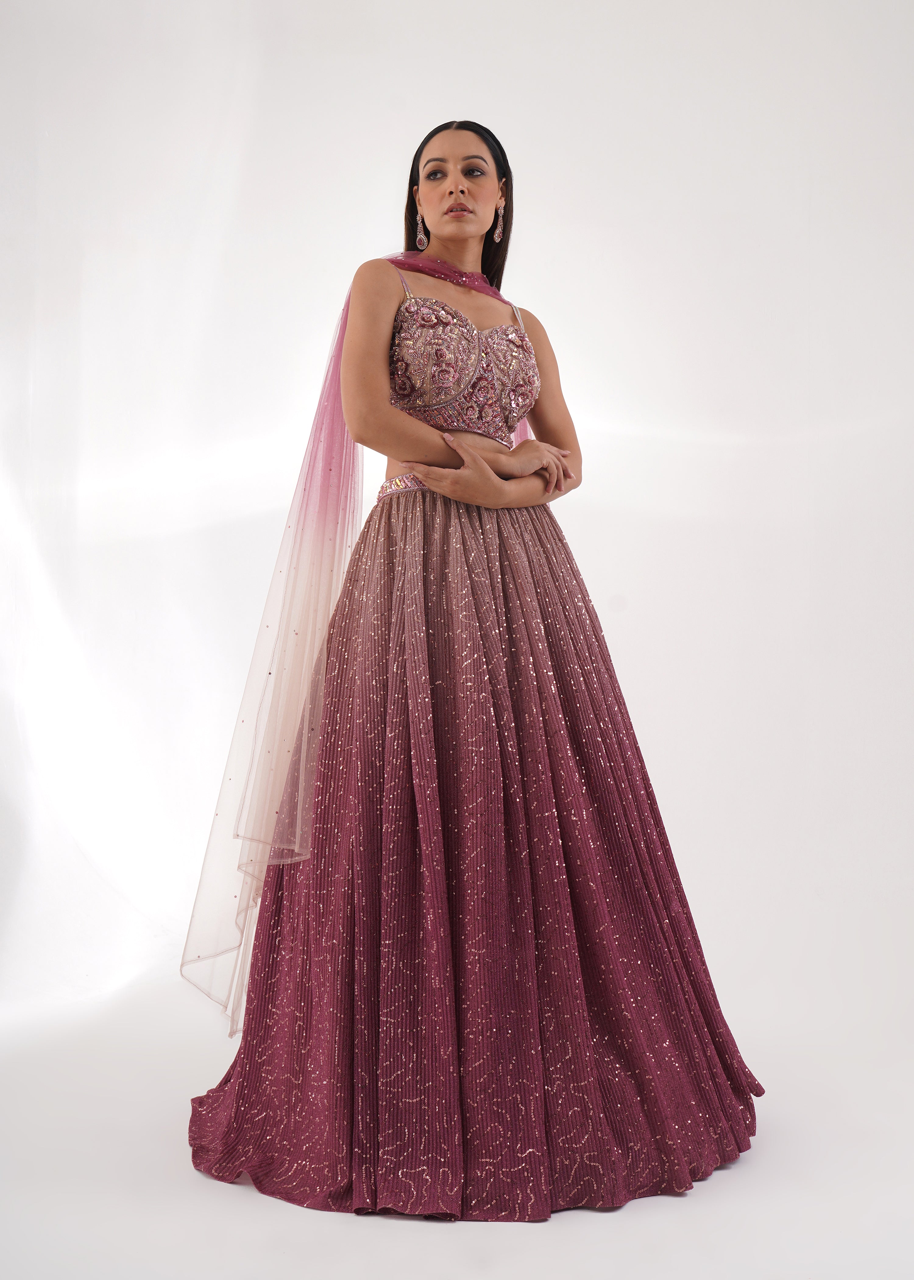 Featuring a dusty pink lehenga in lycra base. It is paired with a blouse having sequins and cutdana embroidery, including a dupatta.
