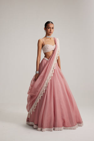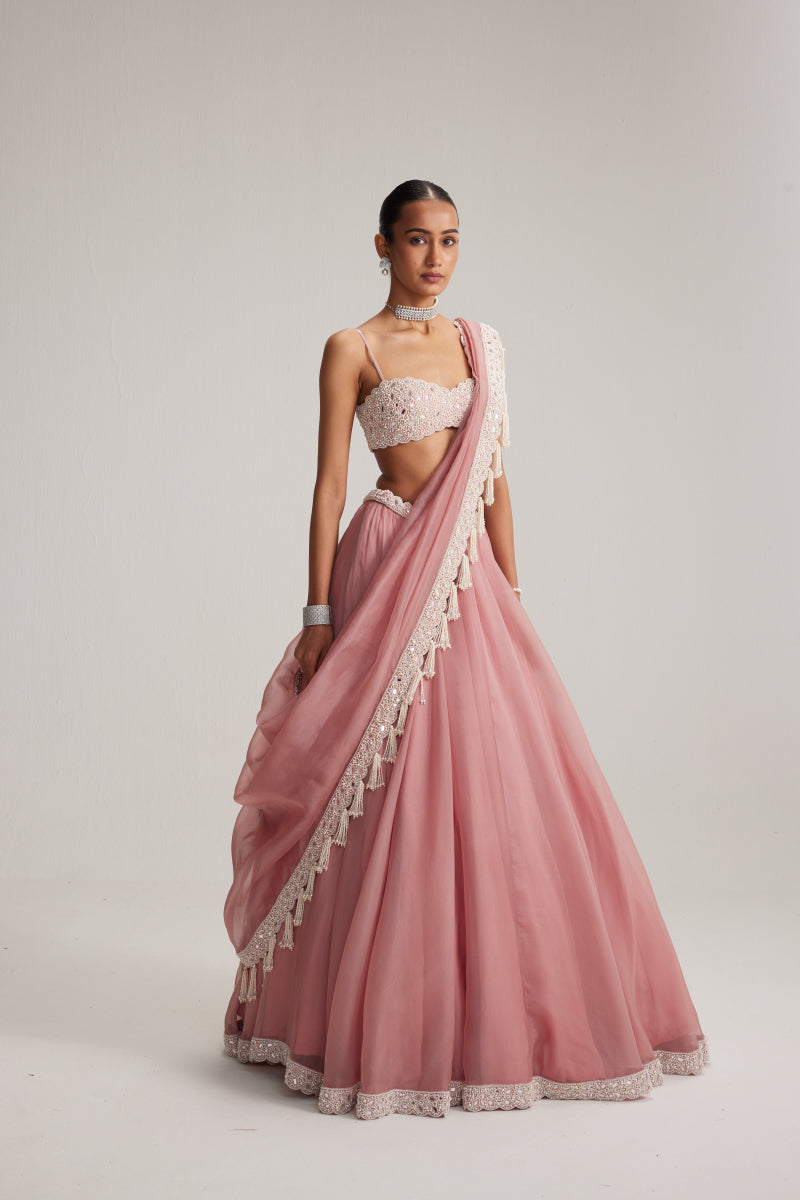 Dusty Rose Organza mirror and pearl lehenga set, paired with a heavily embroidered blouse and dupatta .